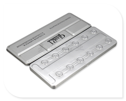 這款12色眼影彩妝鐵盒,是常規(guī)的化妝工具包裝產(chǎn)品,鐵盒風(fēng)格參照了KR彩妝鐵盒進(jìn)行設(shè)計(jì)。鐵盒依舊為鐵線翻蓋鉸位,蓋面與底部都有激凸工藝處理,而蓋面為提升效果的矩形平雕工藝,而底部為適合十二色規(guī)格的彩妝盤雕刻,而彩妝盤雕刻可根據(jù)客戶的需求進(jìn)行制作八色、二十四色等。