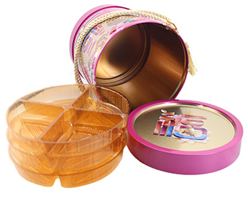 此款粉色珍情珍意月餅鐵盒的尺寸為∮220*265mm,為了順應(yīng)多樣化的市場包裝需求,這款茶葉馬口鐵盒可做成心形、正方形、橢圓形、車形、書本形等異形造型。