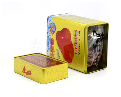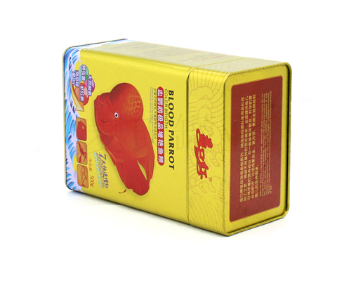 此款寵物食品包裝鐵盒為麥?zhǔn)瞎迾I(yè)為廣大客戶推出的血鸚鵡魚飼料鐵盒子,此款鐵盒的規(guī)格為140*90*205mm。鐵盒的印刷工藝為CMYK+1專,外過水性亮光油,內(nèi)過符合國家規(guī)定的金油,客戶可根據(jù)自身產(chǎn)品的需求選擇啞油、皺紋油、爆炸油等印刷工藝。