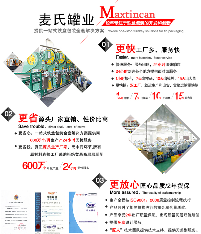 此款鹿角膠馬口鐵盒所采用的材質(zhì)、油墨、配件等產(chǎn)品均為綠色環(huán)保材料,,產(chǎn)品曾多次通過機構(gòu)認證檢測,其中包括:FDA、SGS、LFGB等,鐵盒從生產(chǎn)到出庫,全程無塵車間制作,QC全檢,保證每一款鐵盒都標準、安全。真正打造國內(nèi)鐵盒包裝品牌。