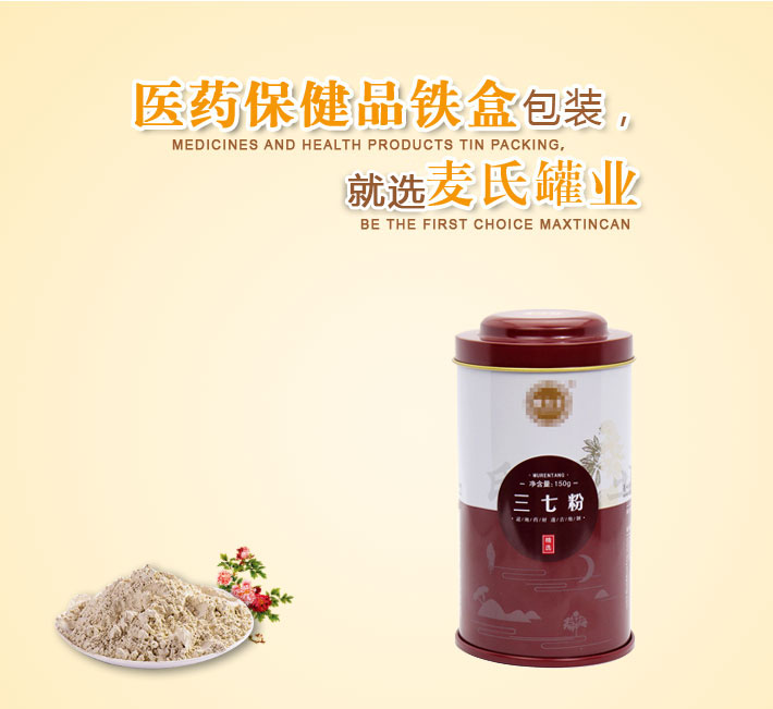 此款供應(yīng)三七粉包裝鐵罐,包裝容量為250g,是我司精心打造研發(fā)的保健品系列鐵盒包裝產(chǎn)品,突破了傳統(tǒng)的三七粉鐵罐包裝方式!